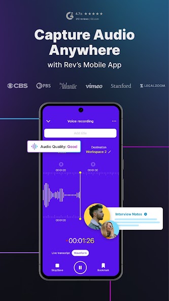 Capture and transcribe speech securely using Rev's powerful all-in-one audio recording and transcription app. Perfect for meetings, interviews, and note-taking on the go.