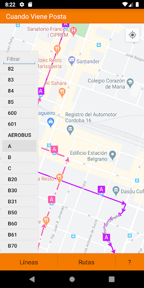 Through its simple interface you can easily identify the routes and stops of your preference collective line on the city map. With only two touches on the screen you will know the arrival time of this line at the chosen stop. These schedules are given in real time, that is, it is not the expected arrival schedule but the real time of the group. Although occasionally the system returns a scheduled schedule instead of real time.