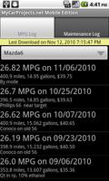 "View Logs" -- View a complete history of your MPG and maintenance logs. Use your phone's menu button to refresh data from the website, view basic stats, and export your data to a CSV file.