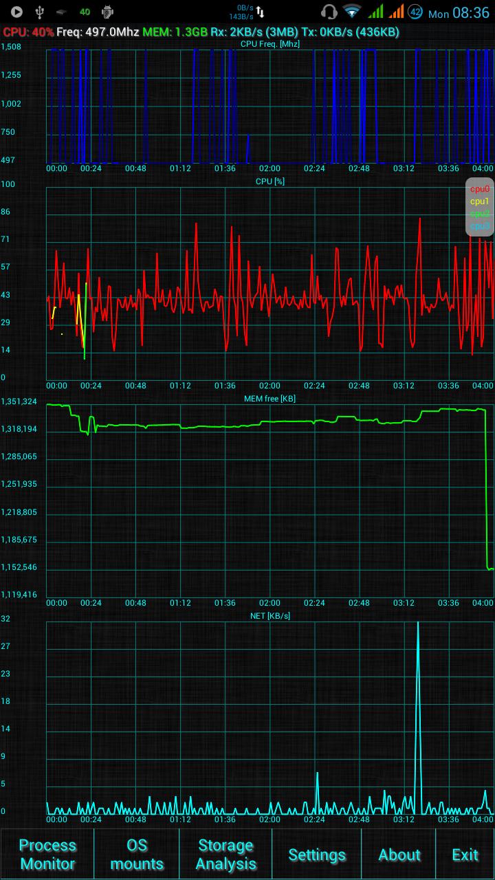 ! Unlike some other app, u can see graphs for longer period (period length can be chosen), other app show graphs only since that app is started and is visible to user. MKSysMon is different... MK System monitor can do much more ! It gathers data on background, so anytime u return to SysMon, u will see ALL data for whole selected period. Support multi-core devices.CPU1 is shown with red color, CPU2 is shown with yellow. NOTE: graph for CPU2 might not be fluent, in fact only dots and short lines in time may be shown because CPU2 is running for shorties necessary time, sometimes it runs even for a simple second!