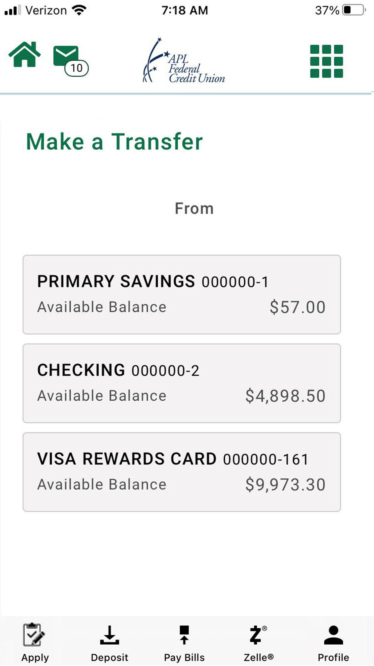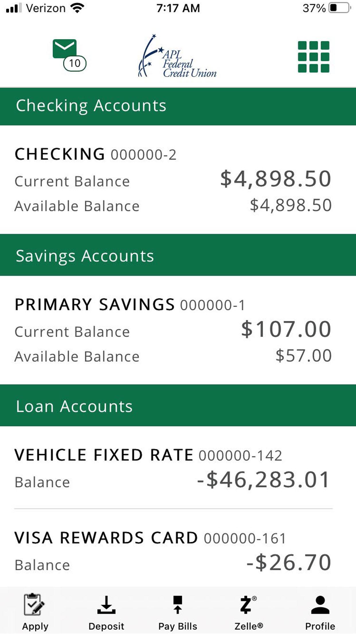 Our APL FCU Android app gives users the ability to check account balances, review transactions, transfer funds, pay bills, make mobile deposits and even apply for a loan or additional accounts.