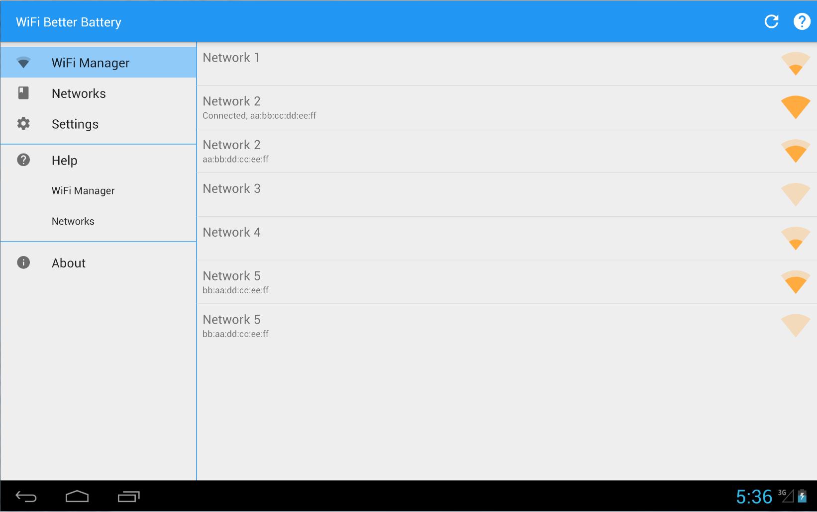WiFi Better Battery also comes with an optional security feature. It is a little known fact how insecure Android's WiFi functionality is. By default, Android only checks the name of a network before connecting to it. That means that if you have a network saved, and Android detects another network with the same name, Android automatically tries to connect to it. A malicious device could use this to collect passwords that are sent during connection attempts or send harmful data to your device. WiFi Better Battery offers an optional MAC address check to try to prevent such attacks. MAC addresses uniquely identify a device.