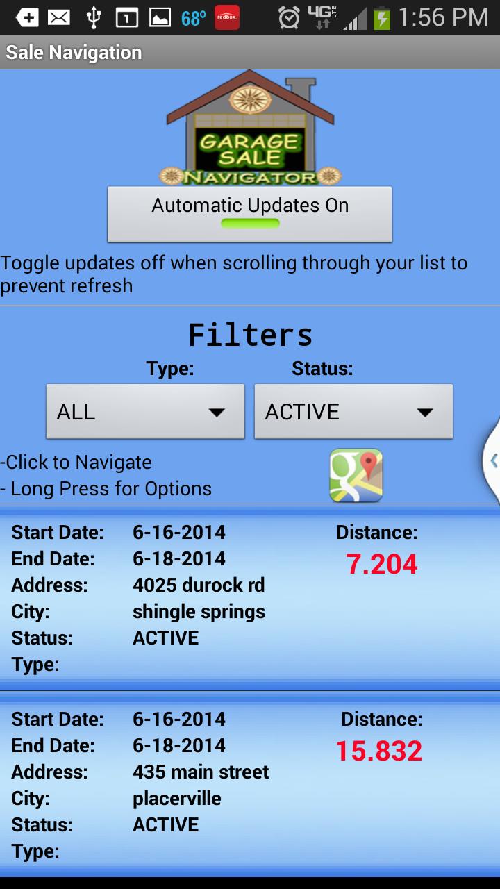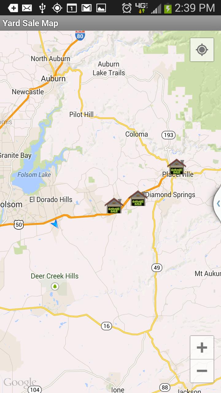 Input your yard sale or garage sale addresses into the application database. You can then view all sales you have added which are sorted by the closest distance to your current location. You no longer have to drive around in circles looking for those sales. This provides easy navigation and updates the distances to the nearest sales based on your GPS location.