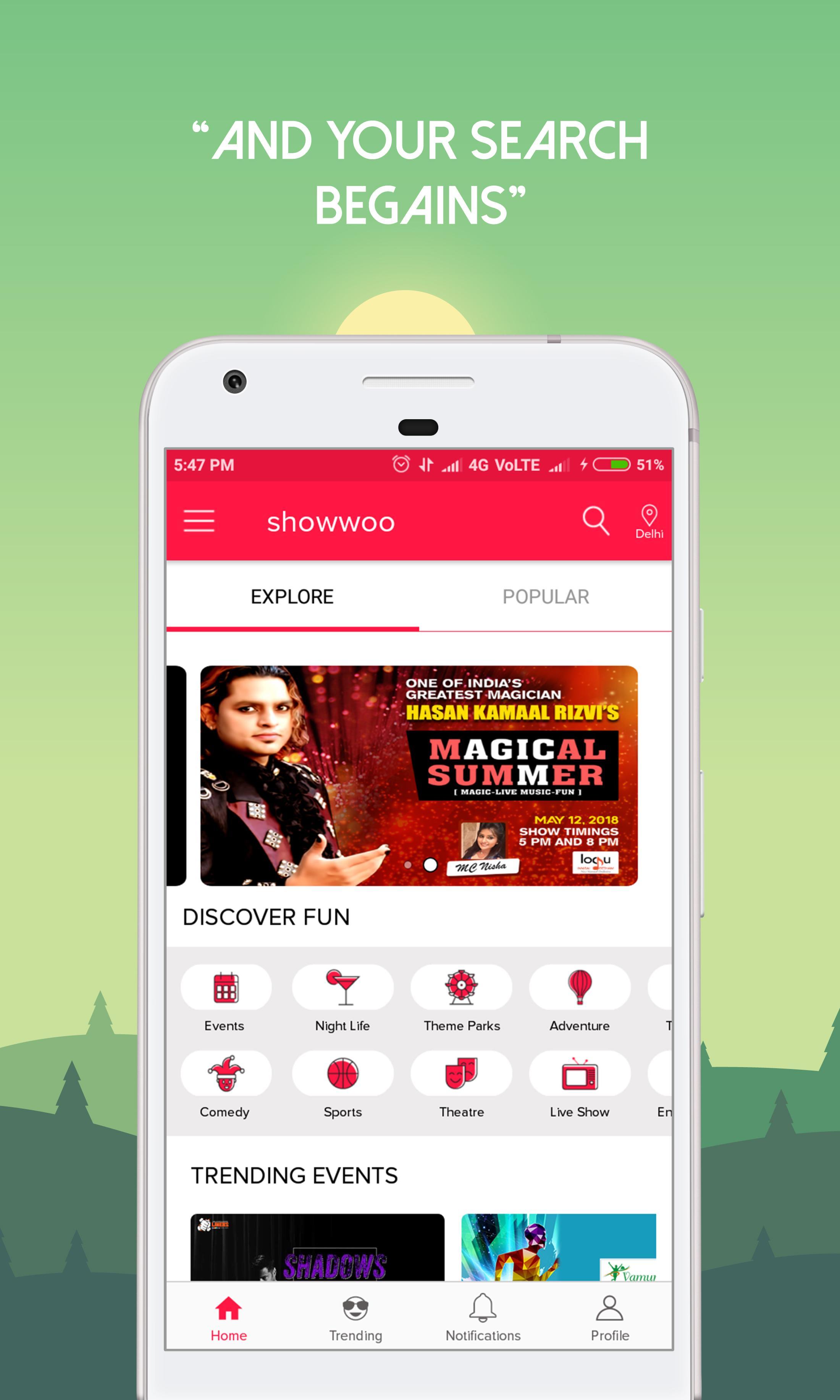 Showwoo provides an easy accessible platform for booking and selling Event tickets. We cover, ranging of entertainment categories like- events, sports, concerts, nightlife, adventures, technology, amusement shows, theater and comedy show. Showwoo is providing its services in top Indian cities i.e. Delhi, Mumbai, Kolkata, Chennai, Bengaluru, Chandigarh, Goa, Hyderabad and Ahmadabad in popular different categories of entertainment. We are a single window of ticketing solution that ensures customers to get ticket of top amusement-shows in their city. Show is already partnered with ace Entertainment service provider-like Events, Live Show, theater, adventurous activities, out door , night-out and sports activities etc. Providing an easy to access online ticket booking platform is our ultimate goal and we improvise our app time to time. Showwoo ensures that customers do feel that our mobile App is the best and a well organized place to check for all Events around you. With Showwoo, ticket booking has now become an effortless, fun and exciting experience for all kind of entertainment tickets. We have something for client too Vendors/partners/clients can sell their tickets by publishing their event or show on Showwoo. Contact us through App and list your event Today.