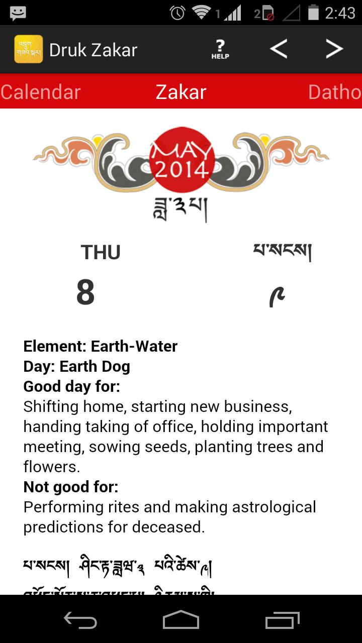 -Daily Zakar (prediction) in English and Dzongkha, until the next Bhutanese New Year with options to check Zakar for future dates.
