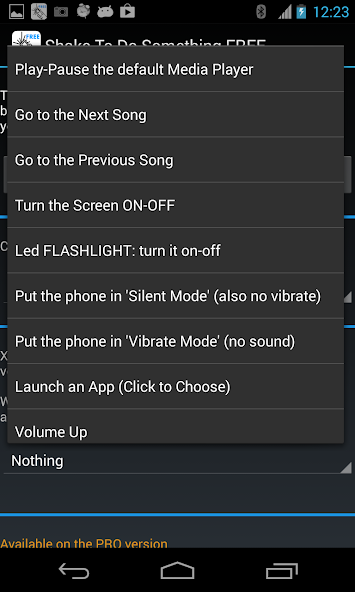You can set up to 3 different actions simultaneously. Each axis of movement (left right, up down, front back) can be set to fire a different action when the device is shaken. ON THE FREE VERSION ONLY ONE ACTION CAN BE SET, ON THE X AXIS.