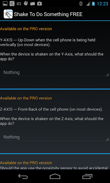 1 - you can set 3 different actions to be fired, one for every axis of movement, instead of the single one available on the FREE app.