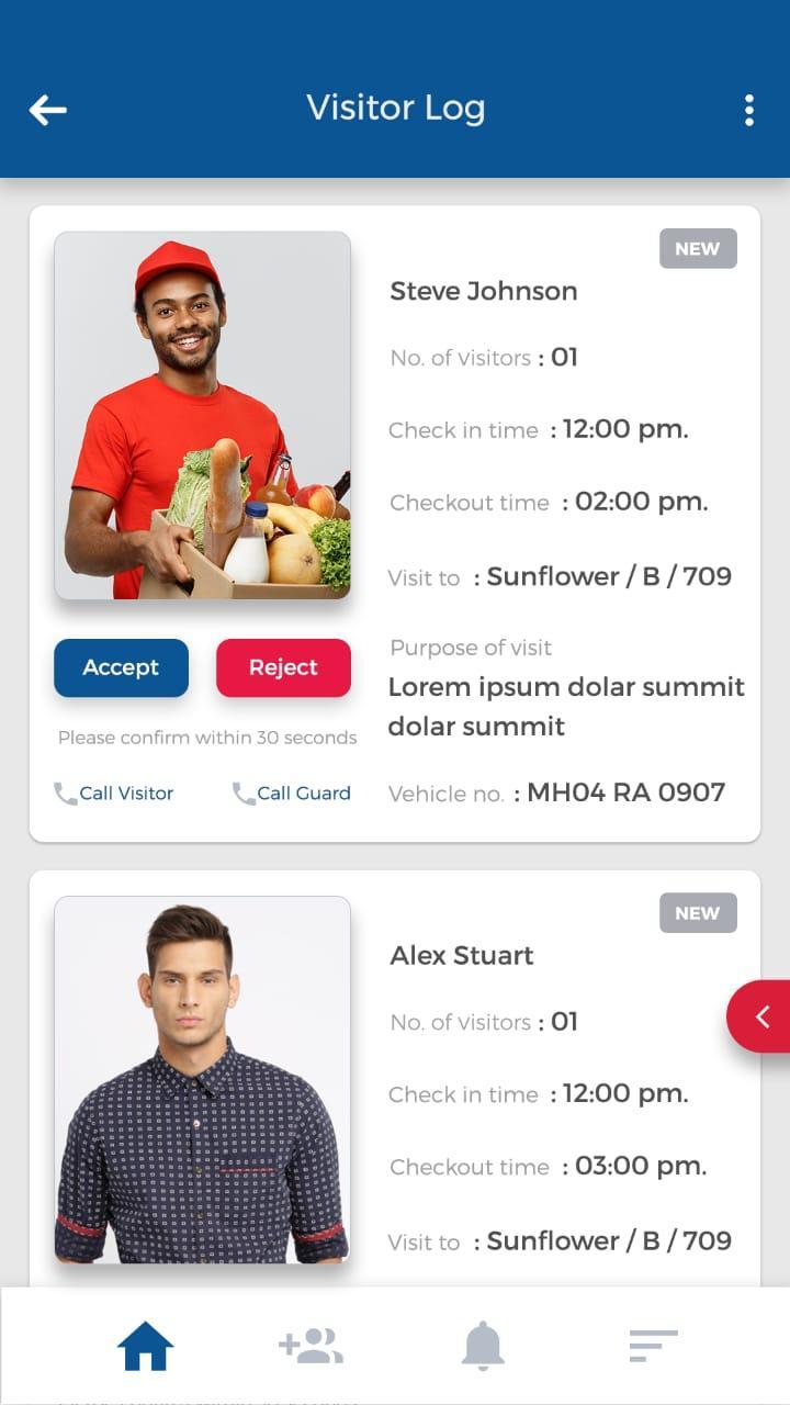 Residents in societies, condominiums & gated communities are instantly notified of visitor information in their mobile Biizlo app by the Biizlo Shield app operated by the trained security staff stationed at the entry gates who capture following information, viz., name, photo, image, mobile no., wing no. or building name/no., flat no. or apartment no. being visited, purpose of visit, vehicle # and other visitor information. This instantly sends phone notification to relevant residents in their Biizlo app wherever they are. Residents can, then, authorize and manage this activity prior to visitors reaching them.