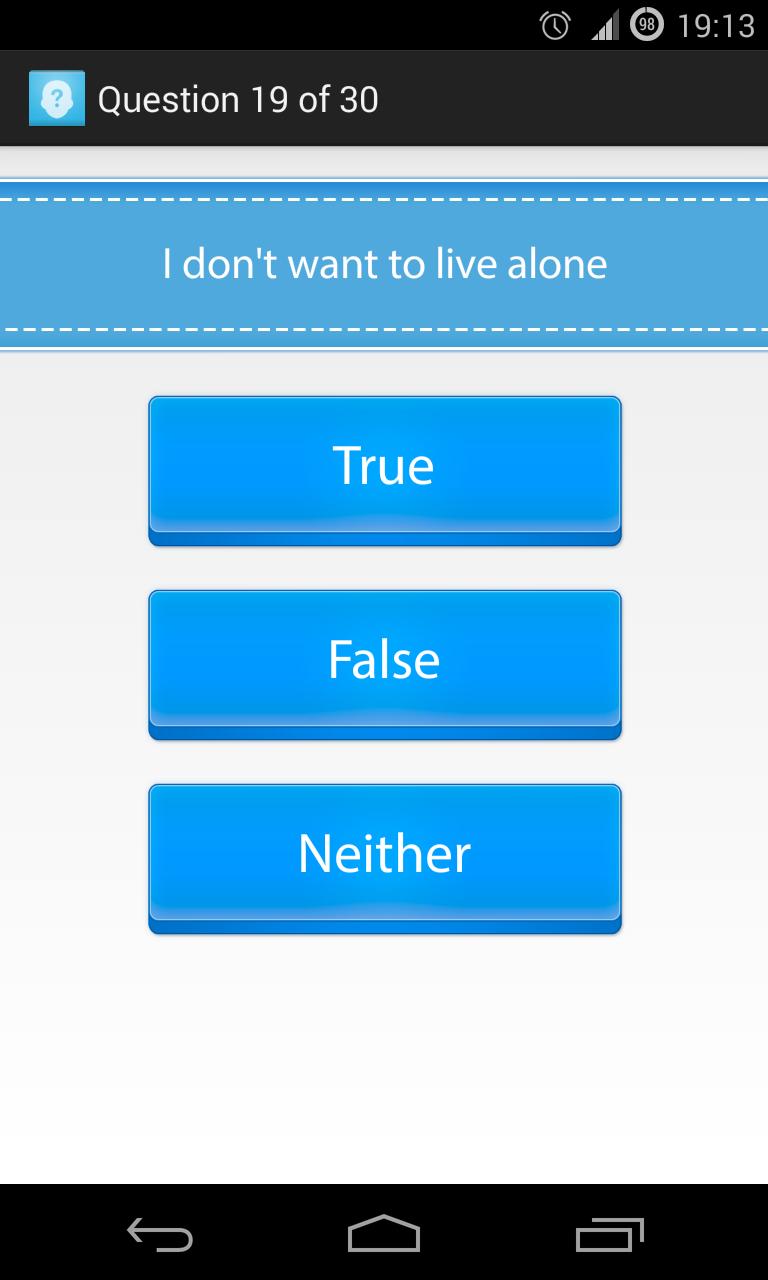 Please note that we can only accept your first answer and you can't change your mind. So you need to make sure you think carefully. We would recommend though that you don't think too hard. Sometimes your first instinctive reaction is going to be the most accurate. If you think, you could end up trying to answer 'young' or 'old' to give a fake result. Just go with the flow and answer as you first think and this will produce the best mental age result.
