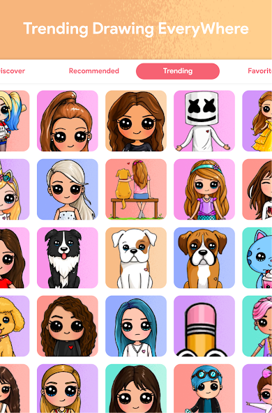 DrawCutie App trains you How To Draw Cute Famous and Draw Cute Girls characters step by step in a simple manner with coloring mode.