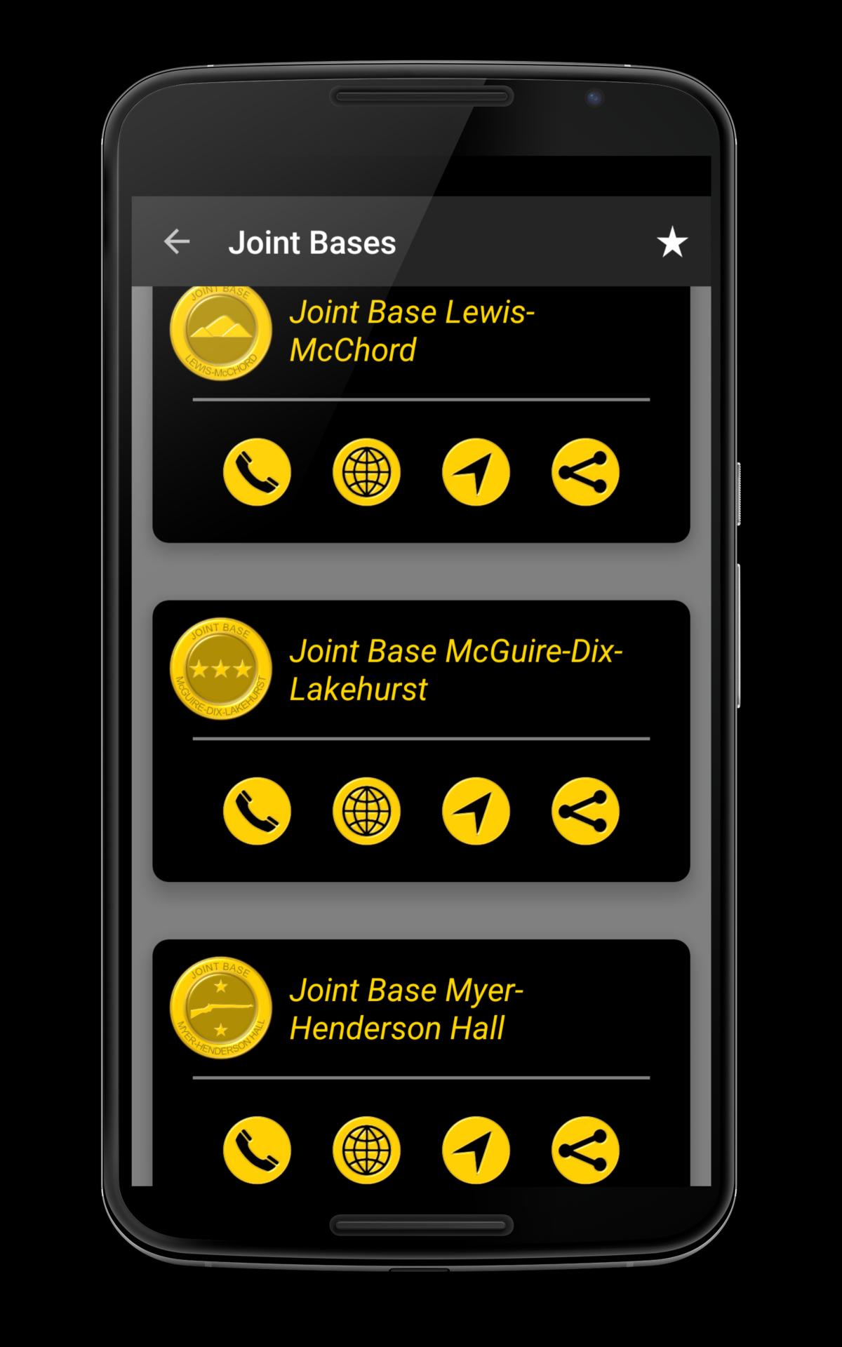 View the website, call, or navigate to selected US Military Bases worldwide. View bases on an interactive map and subscribe to an optional base proximity alert. Receiving a US Military Base proximity alert has never been easier.