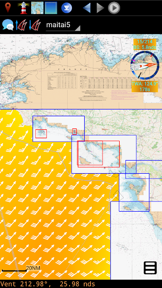 The free version of qtVlm is a full grib viewer displaying all types of gribs and is providing many advanced grib functions. It supports basics charts and some simple instruments. It includes also an Anchor Alarm module, a viewer for shapefiles, for instance those coming from SHOM, and can be configured to receive boat position either from internal GPS or from an external NMEA source connected through TCP, UDP or GPSD.