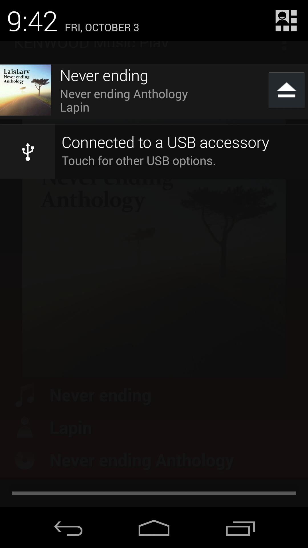 Even if the Android device of OS 4.1 to 7.x does not support USB Mass Storage Class, you can enjoy the music with KENWOOD car-audio receiver. Play or search for music with the KENWOOD car-audio receiver, and check the playing music’s information on your Android device.