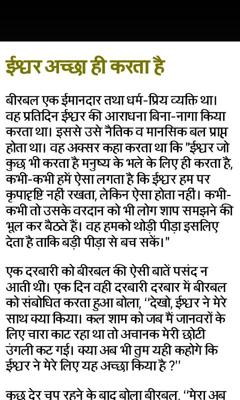 Ram, Bhartiya Lok Kathaye etc. This app is like a comic book. Every age person can enjoy hindi stories with summary. You can also teach lessons to your child by saying them kahaniya of akhbar & birbal in hindi. Bribal is a very famous clever person and he is among nav ratan of akhbar darbar. In this large collection of stories you will get glance of traditional Indian culture. Young person will memories there old day when they are small and request there daadi maa to tell stories of fairy and all. A rich collection of kahaniya is in your finger tips and now say to the others. This app contains collection of tenali raman kahaniya (story), panchtantra kahaniya (story) etc. So be ready to tell sweet story to your child in night when you say good night to every one. This app assist you to be with your children from your busy time and make them happy with every day popular stories in hindi. Deliver them a good childhood hindi stories with moral which help them to live better in there future life i.e. you are making a good citizen for your country.