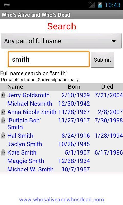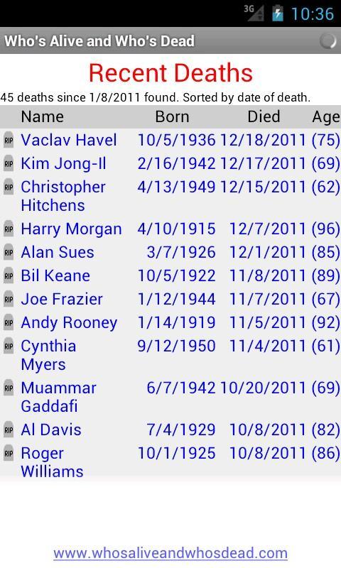 Perhaps you recently saw an old movie or TV ahow, or heard an old song, and got to wondering whether the performer is still alive. Maybe you heard a rumor that a celebrity died recently, and you want to check it out. Or maybe you have a stubborn friend who insists someone has died, when you're sure they haven't, but you need a way to prove it. Whatever your reason is, if you're looking for the quickest way to find out whether someone is alive or dead, this app is your friend!