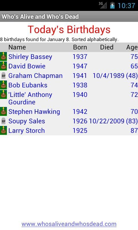 Keep up with which celebrities of our time have died, and which ones are still alive. A Recent Deaths page shows you a list of famous people who have died in the past 365 days. The Today's Birthdays page lets you see who's celebrating a birthday today (as well as those who are no longer around to celebrate). Touching each person's name brings up a details page giving you info like full name, date and place of birth, date and cause of death, and a brief summary of what he or she is famous for.