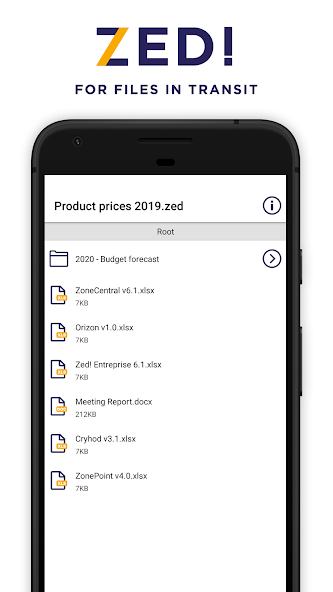 The Zed! application is used with Zed! software (available at www.zedencrypt.com). It allows you to open .zed files sent from a desktop computer.