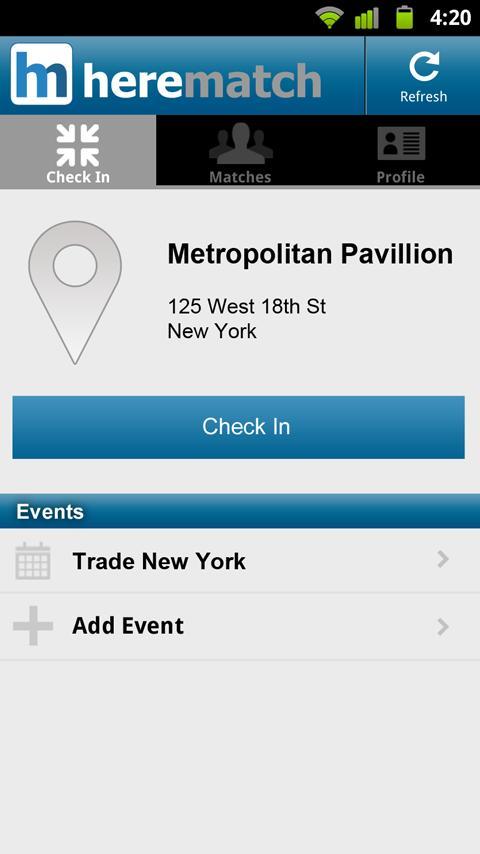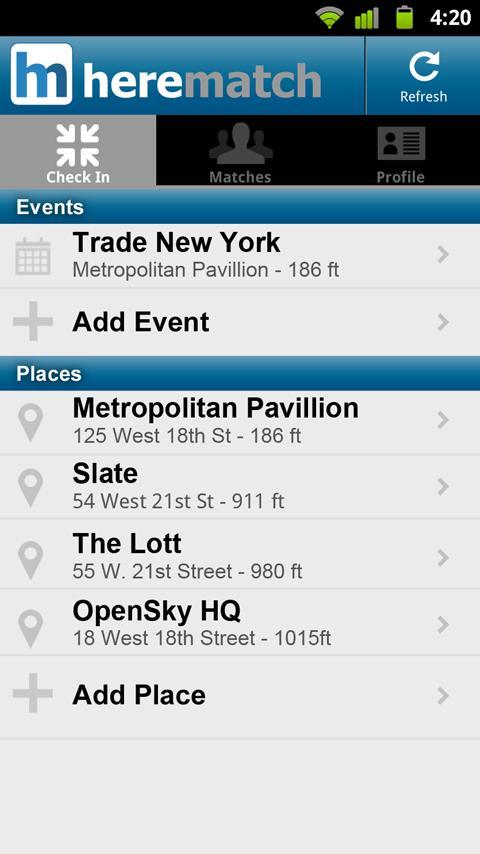 Using the app is simple. Just fill out your profile and check in at places and events. herematch will automatically display a list of people in the room that you want to talk to – and who want to talk to you.