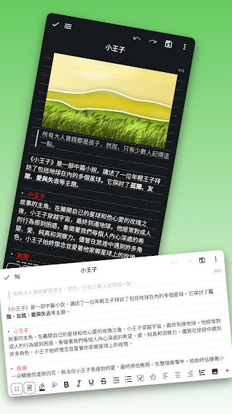 • Rich text formatting: Easily customize text color, style, size, and spacing.