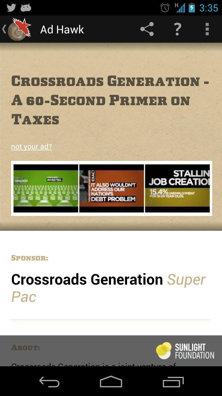 Ad Hawk was produced by the nonpartisan nonprofit Sunlight Foundation. The app helps Americans know who spends money to influence their votes by providing valuable contextual information about the TV and radio ads they see during the 2012 elections.