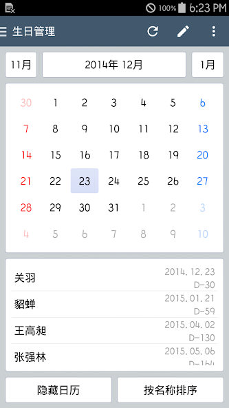- It reminds you about family or friends' birthdays. It supports calendar mode.