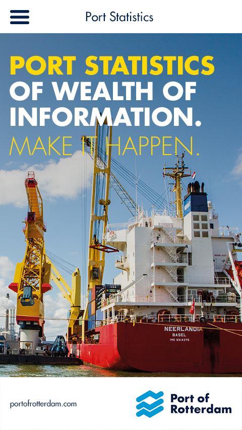 The Port Statistics App gives you an overview of all kind of quantities, percentages, statistics and rankings concerning the Port of Rotterdam and other European and world ports. The App is an initiative of the Port of Rotterdam Authority. The data is updated twice a year and is also available in a printed brochure.