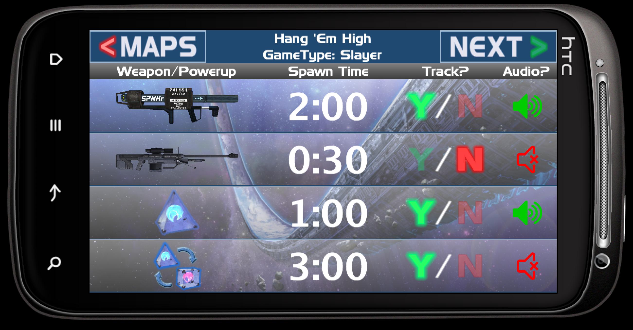 This halo timer app has audio and visual cues for when weapons and powerups will spawn in Halo : Combat Evolved. Since all weapons and powerups spawn on a timer, this app will keep track of each map's times and give alerts. There is no on screen indication of when these items spawn in game so this app allows the user to do that. Simply press start on the timer when the map loads and the app will count down when the items are going to spawn. You can use this to gain an advantage over other players who don't know when each weapon will spawn and grab items before anyone else.