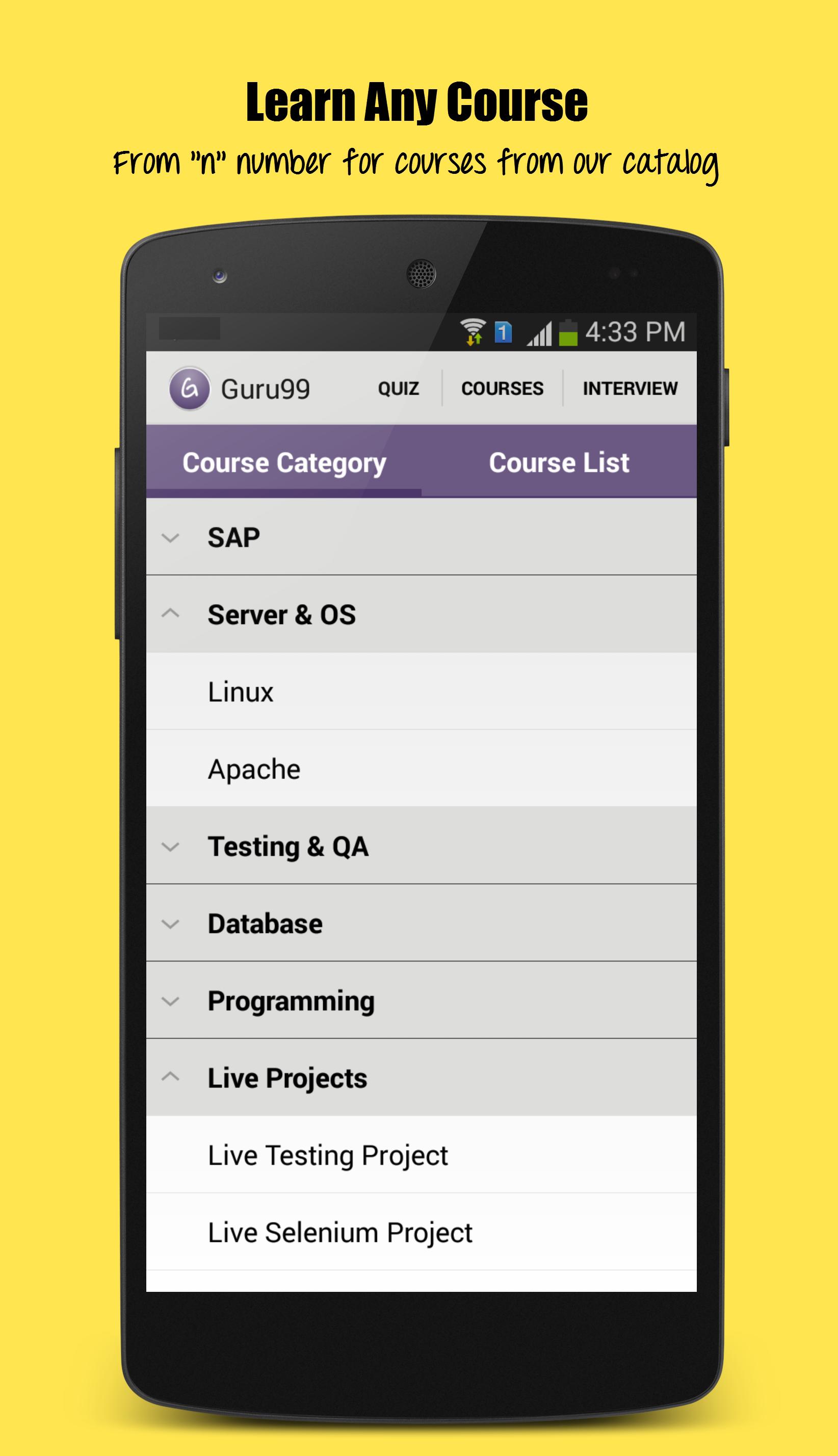 Learning new courses on the go has never been so easy! Guru99’s top-rated education app instantly shows you various courses that you always wanted to learn.