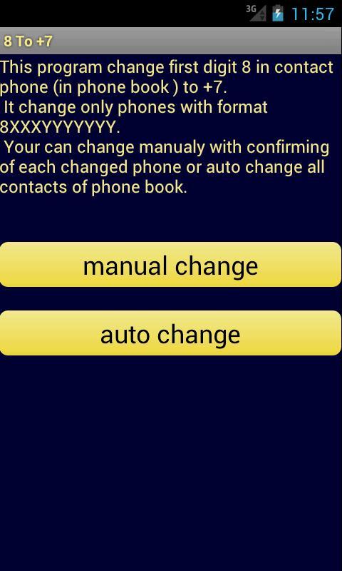 This program change phone from 8XXXYYYYYYY to +7XXXYYYYYYY in your phone book.(i.e. change phone 89161234567 to phone +79161234567).