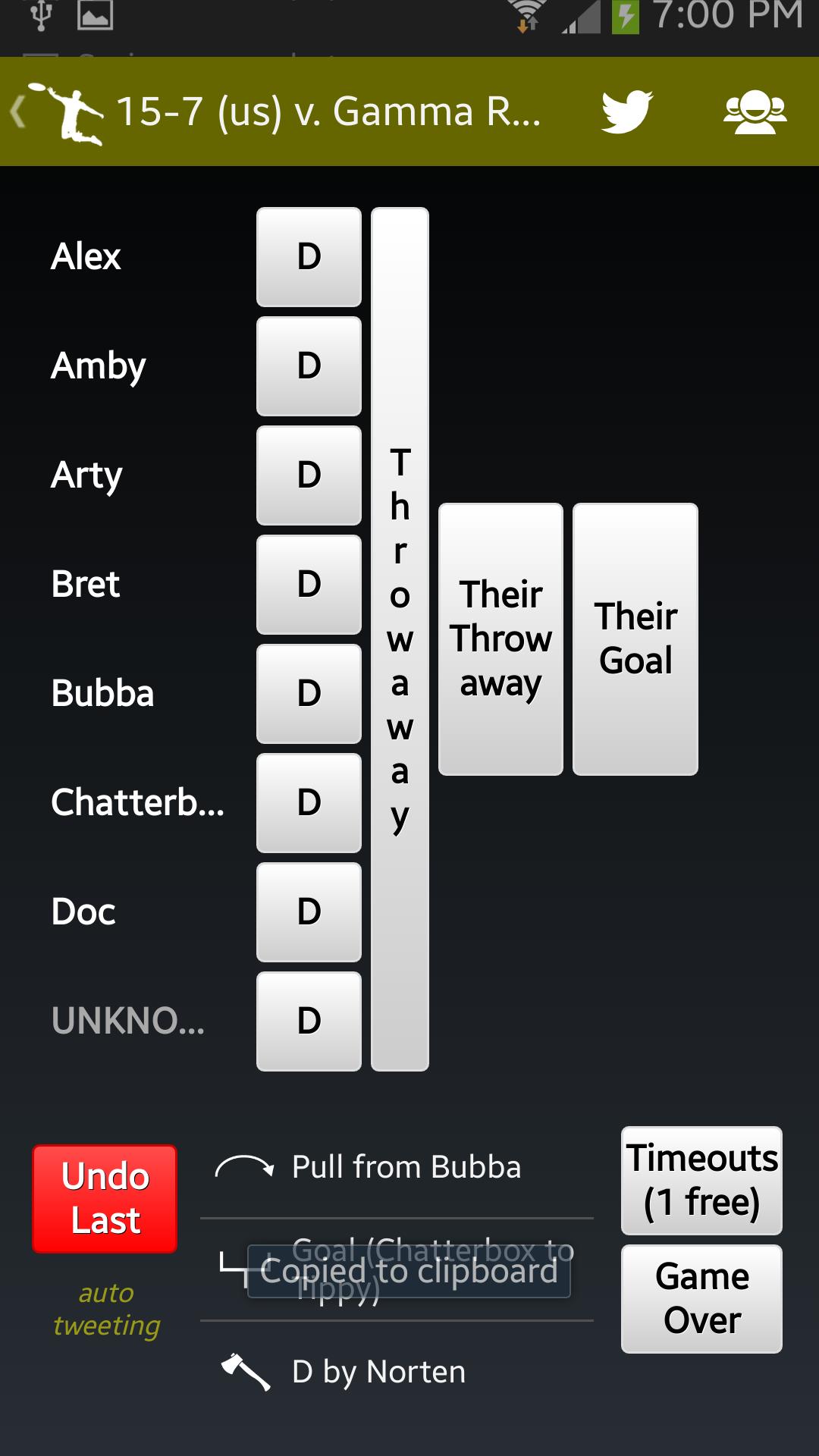 UltiAnalytics is an Android phone/tablet app and web site for tracking statistics for your ultimate frisbee team(s). Users gather stats during the game and then upload the statistics to their team website (provided). The app also features a Twitter interface that allows the user to "auto-tweet" game events as they happen.