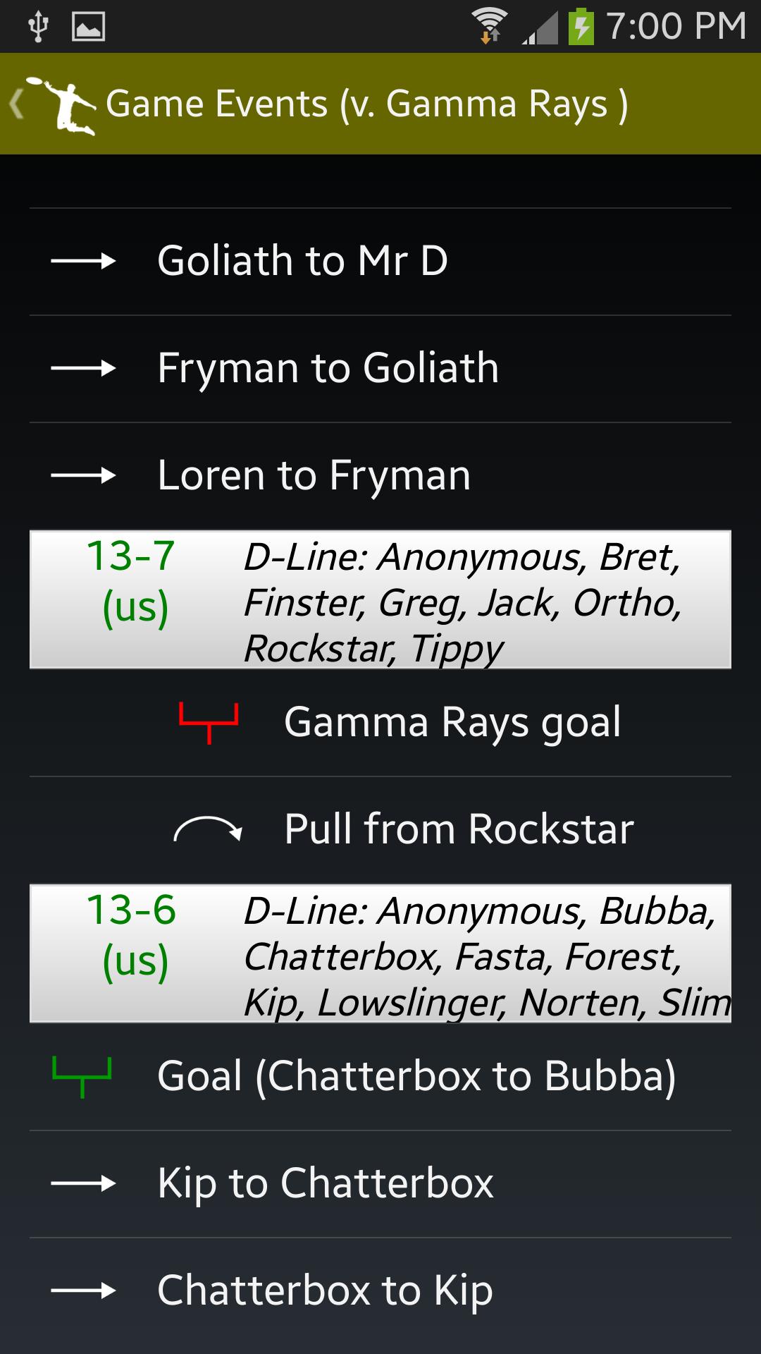 UltiAnalytics is an app for analyzing your ultimate frisbee team statistics.