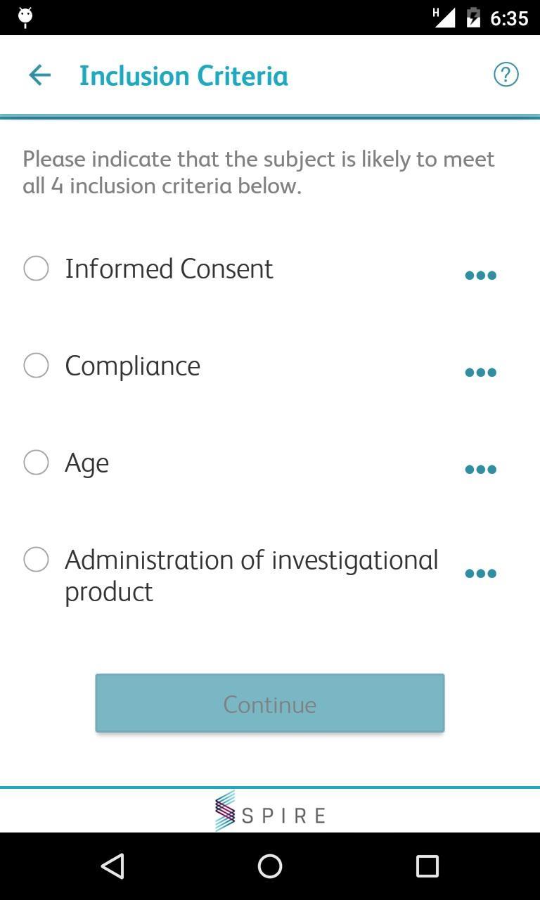 This is an application for site coordinators and investigators participating in the Pfizer SPIRE clinical trial. This tool is meant to be used as an aid for determining the eligibility of subjects for the SPIRE clinical studies during pre-screening and screening. The tool is not intended to replace other standard trial materials, systems and processes provided by Pfizer for these activities.
