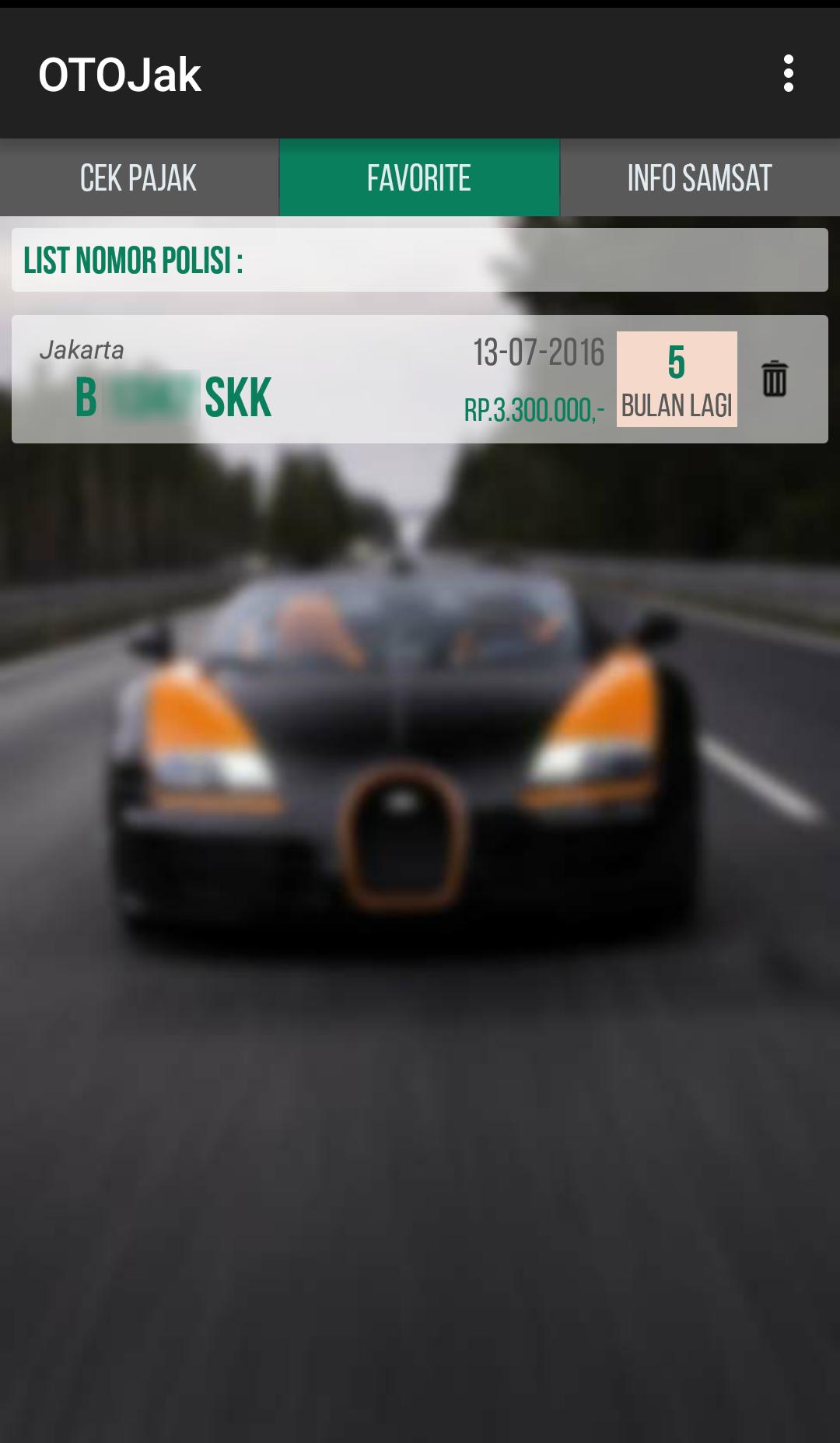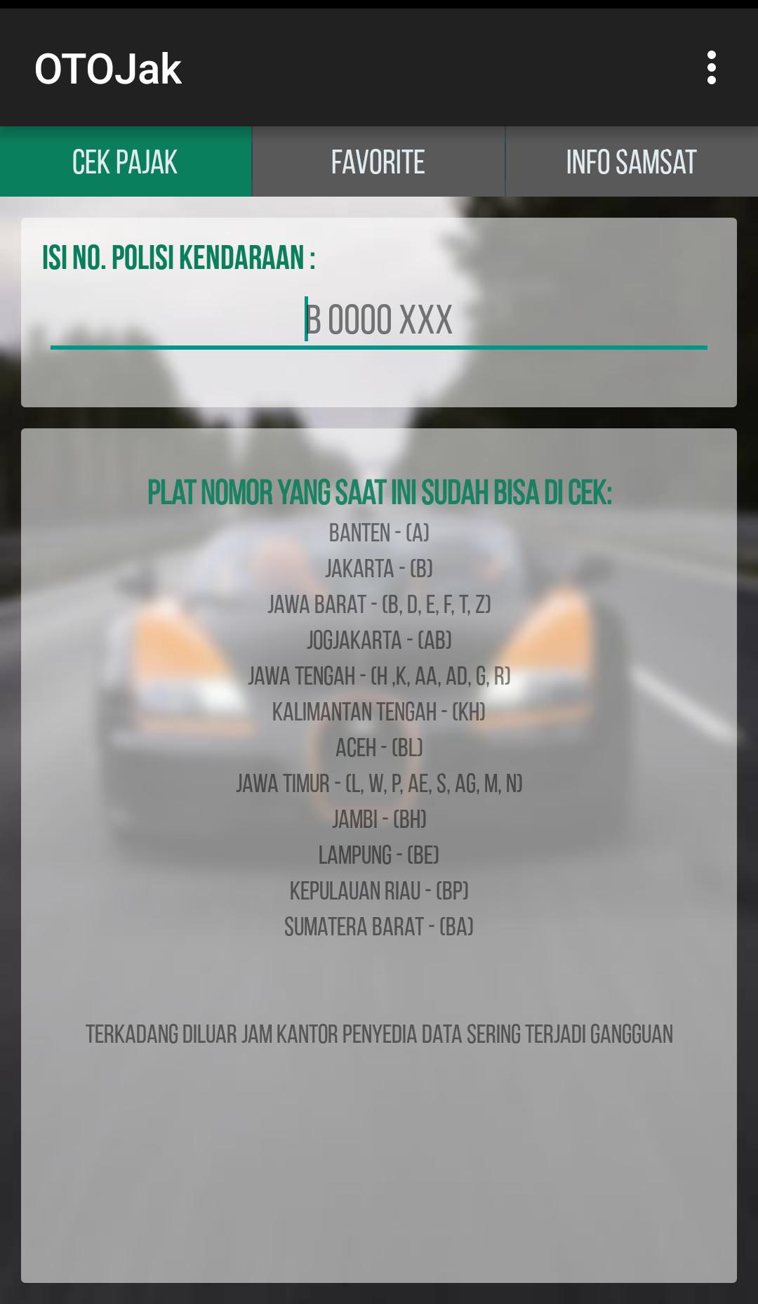 This application features data on vehicle plate numbers along with taxes, information on Samsat location and can be used as a reminder (reminder notification).