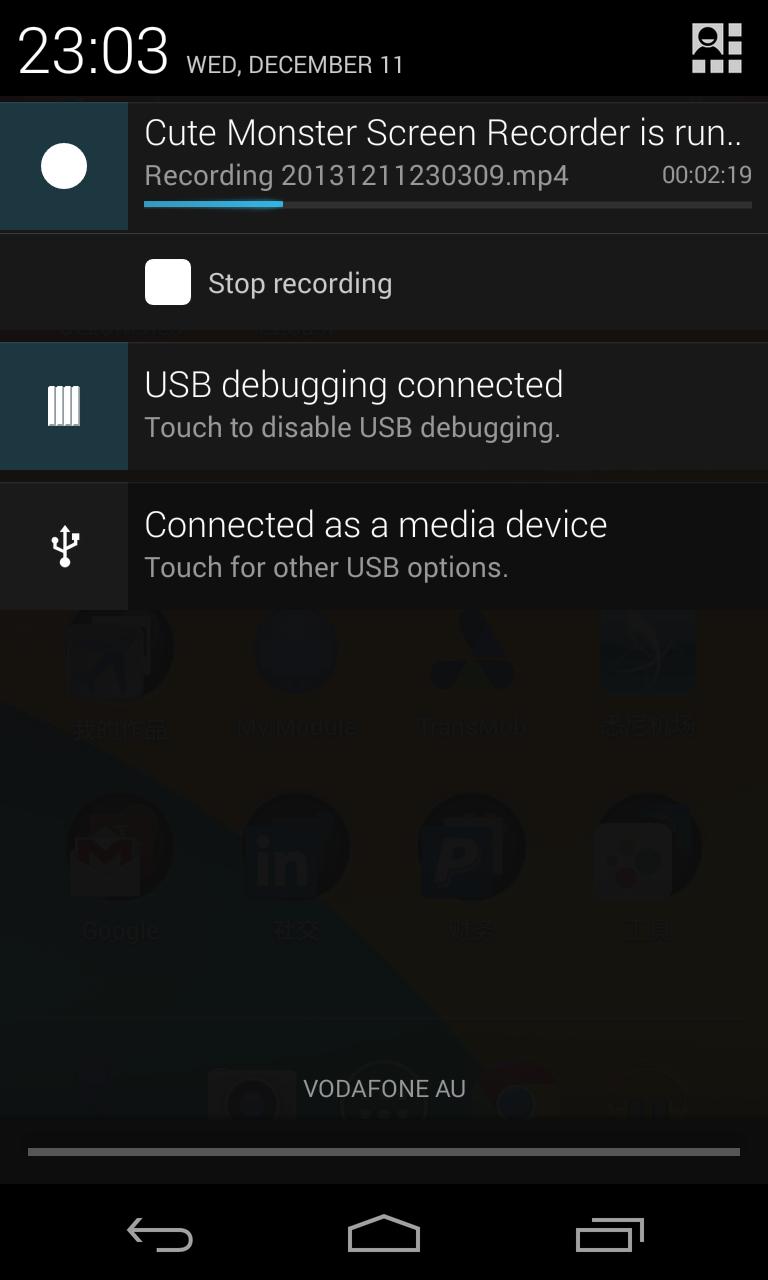 Android 4.4 (KitKat) brings the native screen recording ability. However, it requires connecting device to a computer that has Android SDK installed, and use command-line/DDMS to record screen. This little app lets you record screen without the need of connecting to a computer. With a simple tap, you can record video for every thing happen on your device.