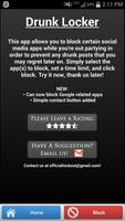 Drunk Locker offers many things such as blocking calls and texts, as well as calling your local taxi service to come pick you up when you’ve had a little too much to drink. Our app also offers you the chance to choose a designated driver for you to call when you're out so that you can be responsible. Drunk Locker allows you to block incoming calls or outgoing calls to your boss, ex's or family members that you do not want to contact when intoxicated. You could say we’re just a friend trying to watch over you.
