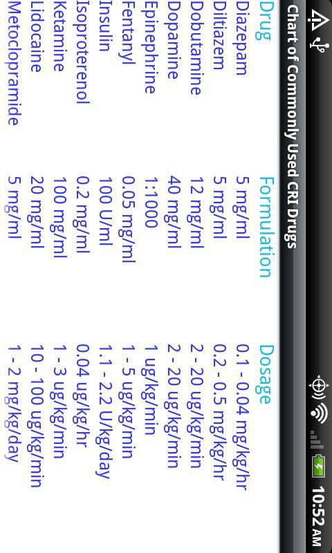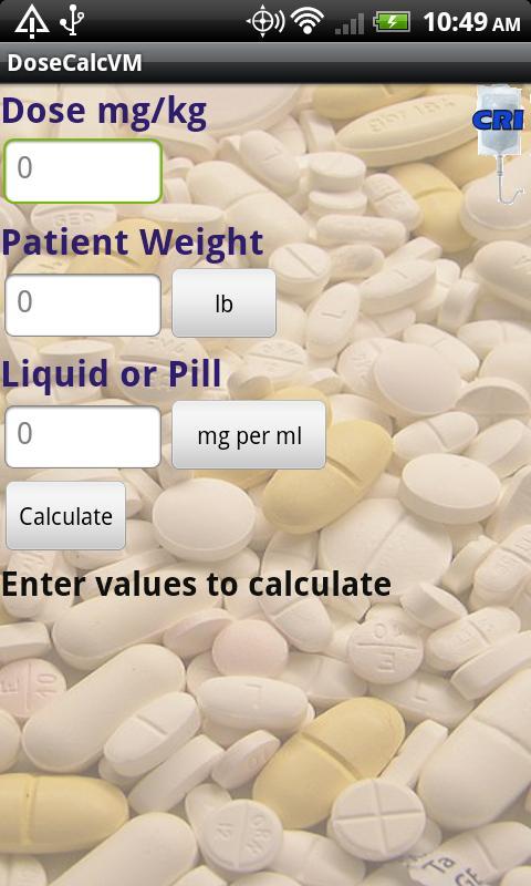 DoseCalcVM includes a single dose calculator and a constant rate infusion (CRI) calculator. A dosage chart for commonly used CRI veterinary drugs is also included.