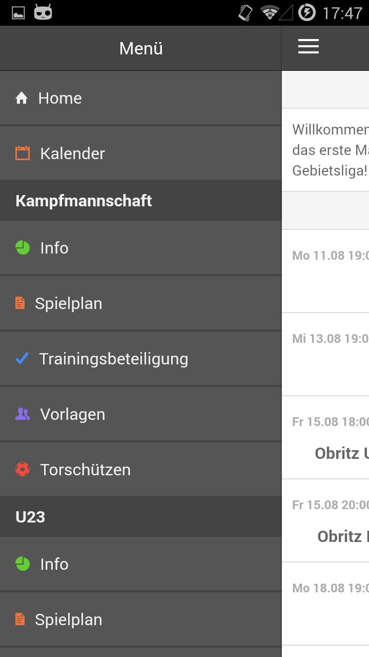 For every game, training or event you can open a detail in which all information (date, time, place, information, ...) are summarized. In the game you can also see the template providers and goal scorers.