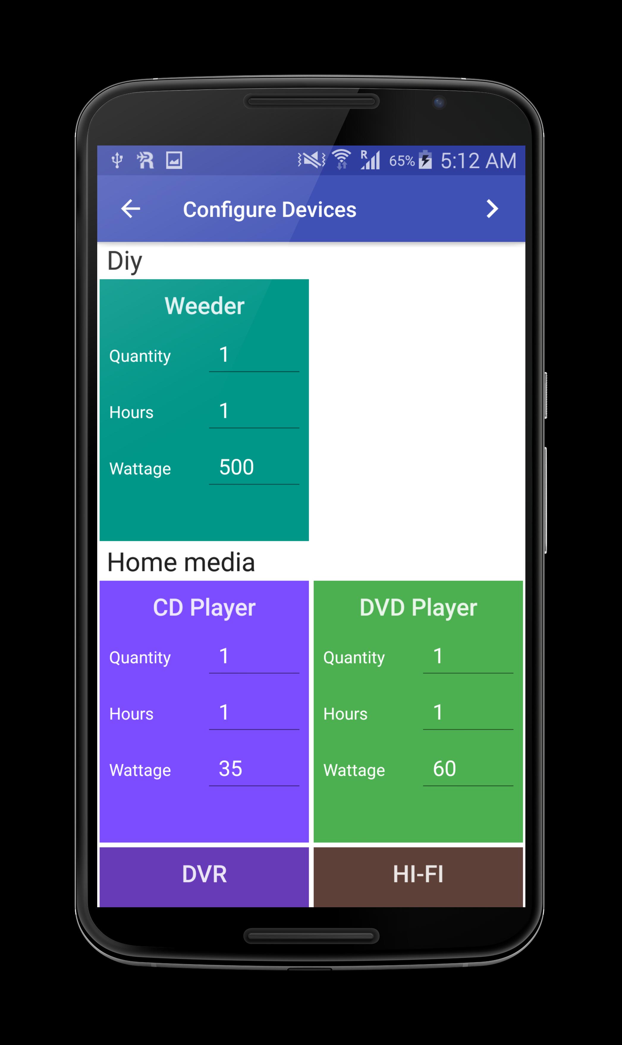 Configure the quantity and daily usage of the devices in the second screen of Solar Calculator