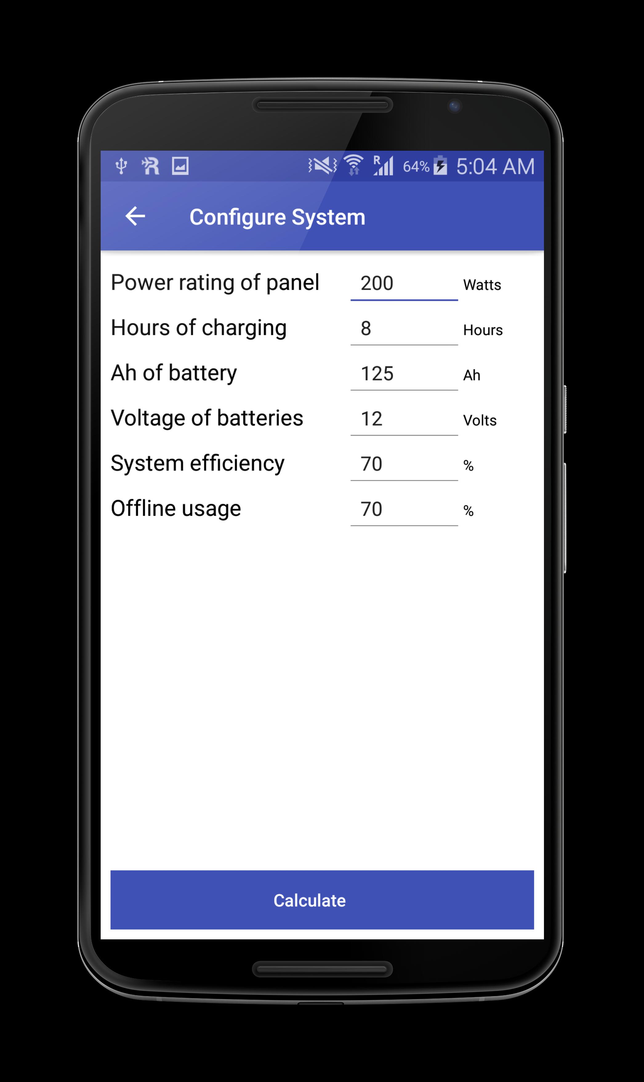 Solar Calculator is used to calculate the number of solar panels and batteries used for daily household usage. It's very easy to use. The calculation is done in three very simple steps.