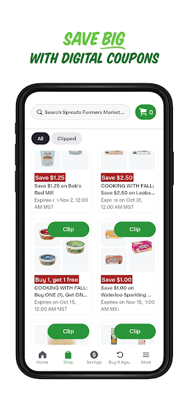 لاسترداد كوبونات "قطع" الخاص بك ، قم ببساطة بمسح الرمز الباركود لحساب Sprouts عند الخروج. مع البحث عن المنتج ، اكتشف ما إذا كان هناك قسيمة رقمية مؤهلة أو أضف العنصر إلى قائمتك.