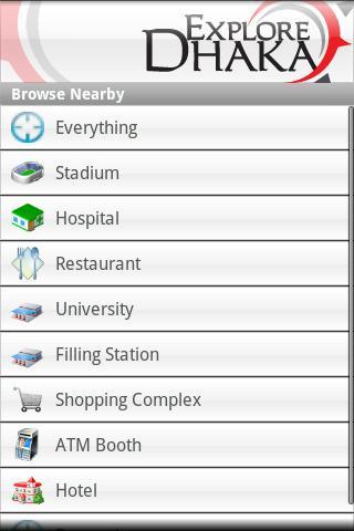 Explore Dhaka يحدد موقعك بسرعة ويسمح لك باختيار أقرب مستشفى ، فندق ، مطعم ، سوبر ماركت ، مجمع للتسوق ، إلخ ، وحتى الأحداث من حولك. لكل قائمة يمكنك اختيار رؤية موقعها على الخريطة ، عرض المسار من مكانك.