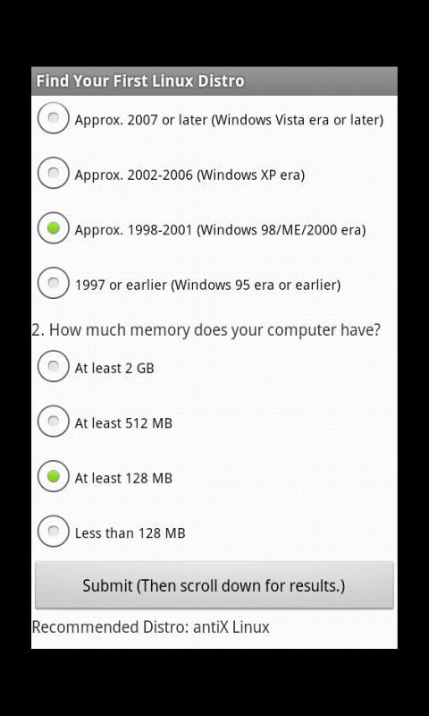 مرحبًا بك في العثور على First Linux Distro - Basic ! هذا الكمبيوتر القديم لا يزال لديه قيمة. يساعدك هذا التطبيق على تحديد توزيعة Linux الأولى استنادًا إلى مواصفات الكمبيوتر الخاص بك.