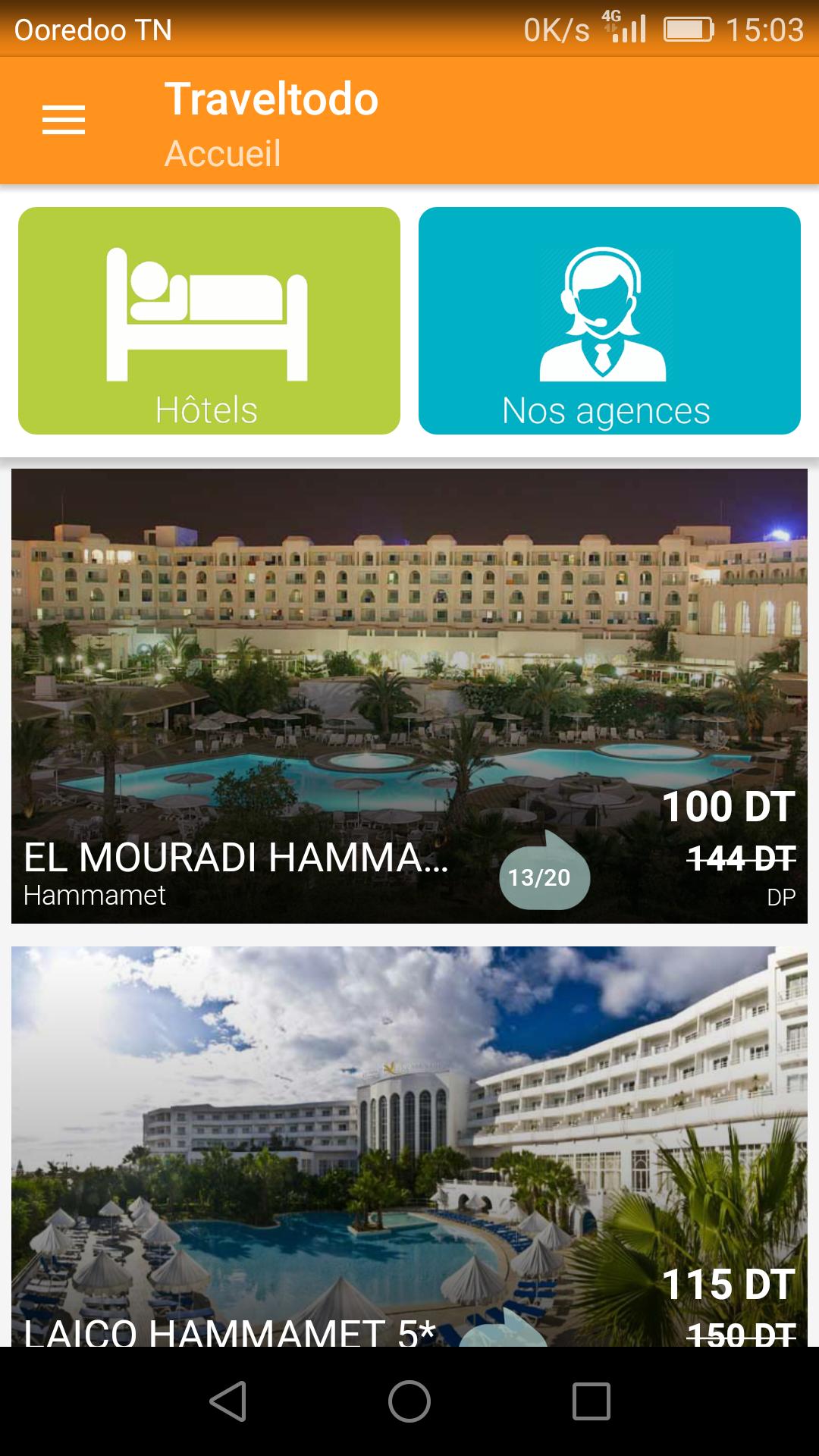 تقدم Traveltodo First Online Travel Agency في تونس مع هذا التطبيق لحجز إقامتك والفنادق والإجازات والرحلات إلى تونس وهاماميت و Sousse و Tozeur و Tabarka. ابحث عن وجهتك المفضلة ، وأدخل معاييرك وتأكيد الحجز الخاص بك واختر الدفع عبر الإنترنت باستخدام بطاقة الائتمان الوطنية الخاصة بك ، أو في نقطة بيع أقربنا من شبكة مكونة من 32 فرعًا. مع هذا التطبيق ، استمتع بخصم 2 ٪ على جميع الحجز في الفنادق المدفوعة عبر الإنترنت.