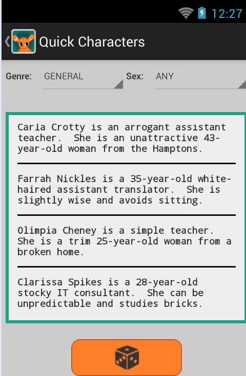 * قم بإنشاء أسماء أحرف عشوائية وأوصاف هي السمة والجنس المحددة.