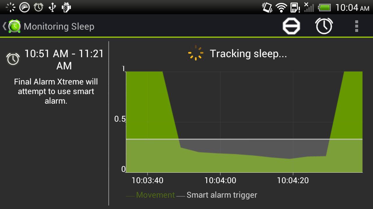 Mit dem Beschleunigungsmesser Ihres Geräts können Sie Ihre Schlafzyklen aufzeichnen und dann versuchen, Sie während eines leichten Schlafzyklus vor dem Einstellen des Alarms vorsichtig aufzuwecken. Die App wird mit einem Timer den Alarm einstellen. Wenn Tracker feststellt, dass Sie im leichten Schlafzyklus sind, wird Sie sanft aufwachen.