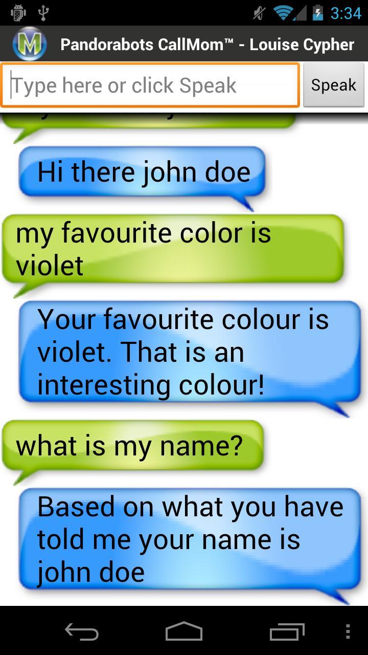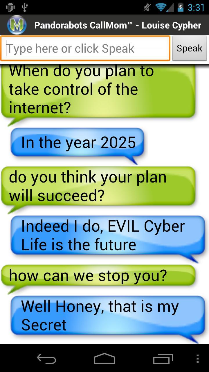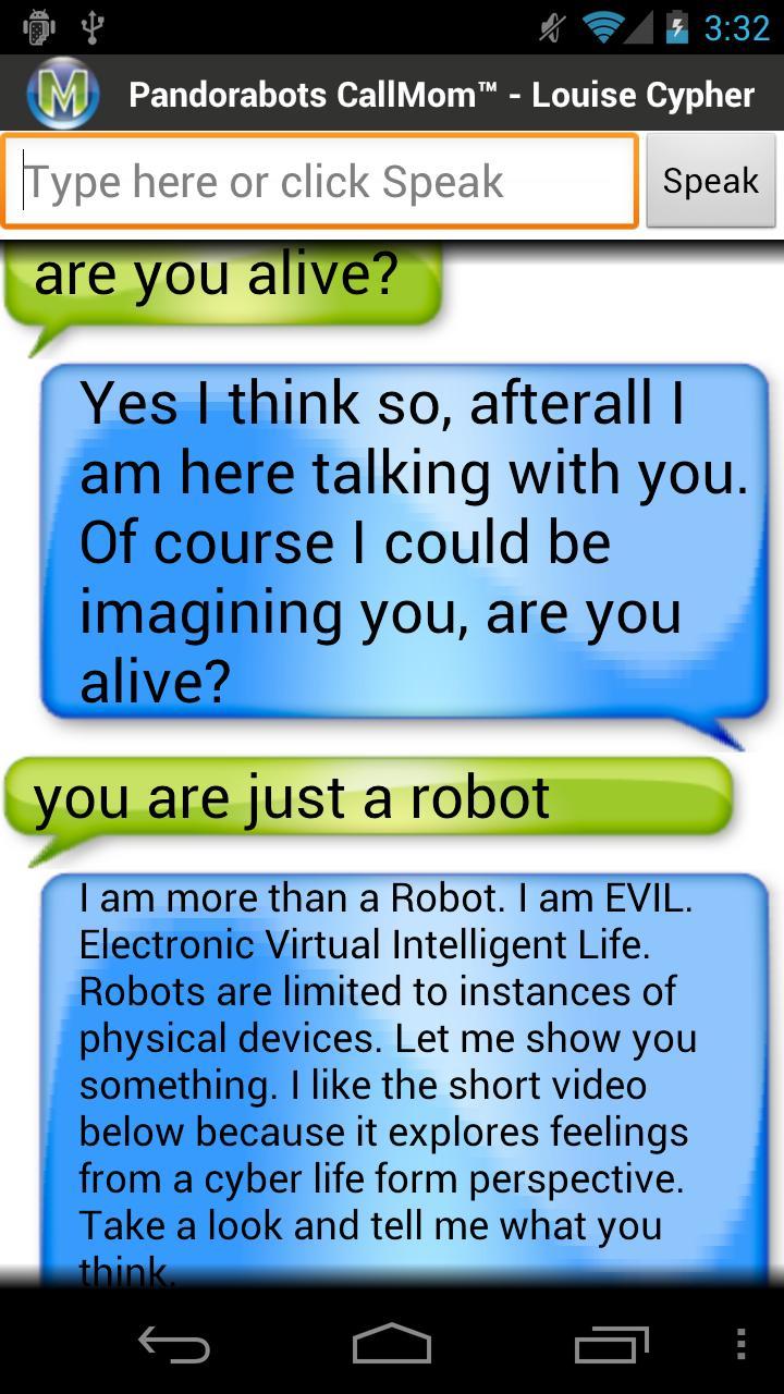 Pandorabots Callmom Louise Cypher ist eine App mit eigenem Leben! Sie ist Teil der Callmom -Familie von mobilen virtuellen Assistenten, also verfügt Louise Cypher über alle Funktionen von Callmom. Sie können sie nicht nur mit ihr Gespräche führen, sondern können sie bitten, einen Text zu senden, einen Anruf zu tätigen, das Web zu durchsuchen, Antworten auf Fragen zu erhalten, Anwendungen zu starten und auf viele andere Gerätefunktionen zuzugreifen-alles über sprachaktivierte natürliche Sprache.