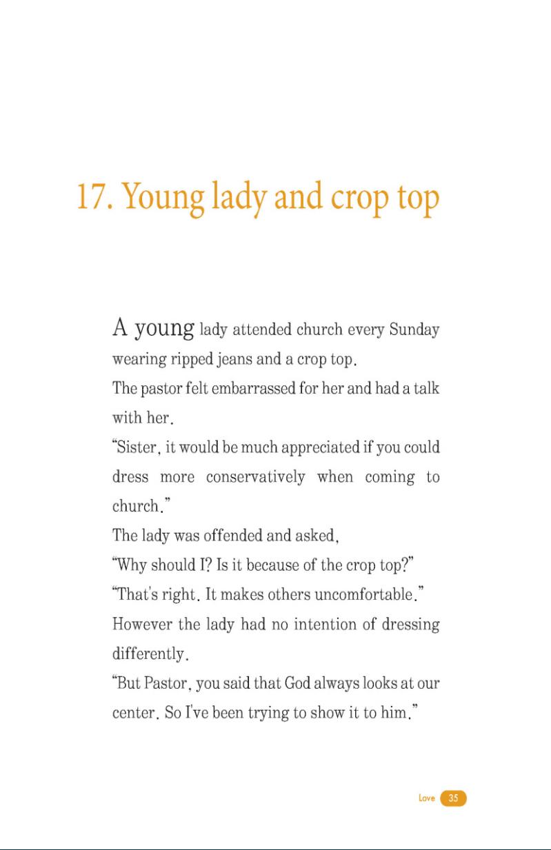 Sie wurden nach Themen geteilt. Das erste Buch besteht aus Geschichten, die sich mit Liebe und Gunst beziehen, während das zweite diejenigen umfasst, die sich um Gebet, Dankbarkeit und Glauben handelt. Sie werden feststellen, dass einige witzig sind, während andere absurd, ironisch und sogar lächerlich sind. Sie bringen dir Lachen, lassen dich aber auch in tiefen Gedanken.