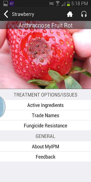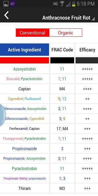Unter dem Feature -Bild der Hauptseite befinden sich aktive Zutaten und Handelsnamen, die im Südosten der Vereinigten Staaten registriert sind. Bei Tippen mit Wirkstoffen kann der Benutzer zwischen den für die konventionellen Produktion registrierten Materialien und organischer Produktion wählen. Wirkstoffe sind nach dem Frac-Code (Fungicide Resistance Action Committee) farbcodiert. Wirksamkeitswerte aus dem regionalen Sprühhandbuch sowie der EIQ -Werte des Feldes aus dem Cornell IPM -Programm sind aufgeführt. Die Quellen der Werte sind im Abschnitt "About MyIPM" aufgeführt. Wirkstoffe, Wirksamkeit und Feld -EIQ -Werte sind sortierbar. Beim Tippen auf einen Wirkstoff werden die registrierten Handelsnamen, die diesen Wirkstoff enthalten, angezeigt. Zurück auf der Hauptseite werden Handelsnamen für herkömmliche oder organische Produktion alle verfügbaren Handelsnamen für die spezifische Krankheit angezeigt, einschließlich Wirkstoffe, PHI -Werten (Vorernterintervall), REI -Werte (Wiedereintrittsintervall) und Toxizitätswerte. Handelsnamen, Wirkstoffe, PHI -Werte, REI -Werte, Wirksamkeit und Toxizitätswerte sind sortierbar. Um schnell Wirkstoffe und Handelsnamen für eine bestimmte Krankheit nachzuschlagen, kann der Benutzer die Krankheit oben auf die Oberseite tippen und eine andere Krankheit im Dropdown-Menü auswählen.