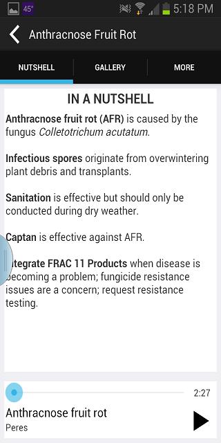 Mit dem Begrüßungsbildschirm können der Benutzer die spezifische Ernte auswählen. Auf der Hauptseite kann er Bilder von Krankheiten von links nach rechts oder rechts nach links durchschieben. Für jede Ernte verfügt die App über ein Dutzend Krankheiten oder Störungen. Krankheitsspezifische Informationen können erhalten werden, indem Sie das Bild der Hauptseite auf das Krankheitsbild aufnehmen und einen Überblick über die Krankheit und ihres Managements sowie ein kurzes Audio von zwei bis vier Minuten vom regionalen Experten auf dem Ende der Seite enthalten. Die Galerie enthält sechs Bilder von Krankheitsanzeichen und Symptomen und gelegentlich ein Schema für vorgeschlagene Managementlösungen. Der Benutzer kann auf jedem Bild zoomen. Im weiteren Abschnitt kann der Benutzer Informationen über die Krankheit und ihren kausalen Organismus (einschließlich Krankheitszyklus sowie Symptome und Anzeichen), Informationen zur chemischen Kontrolle, Informationen zur Fungizidresistenz und nicht chemische Kontrollinformationen (einschließlich biologischer Kontrolloptionen, kulturellen Kontrolloptionen und resistenten Sorten) finden.