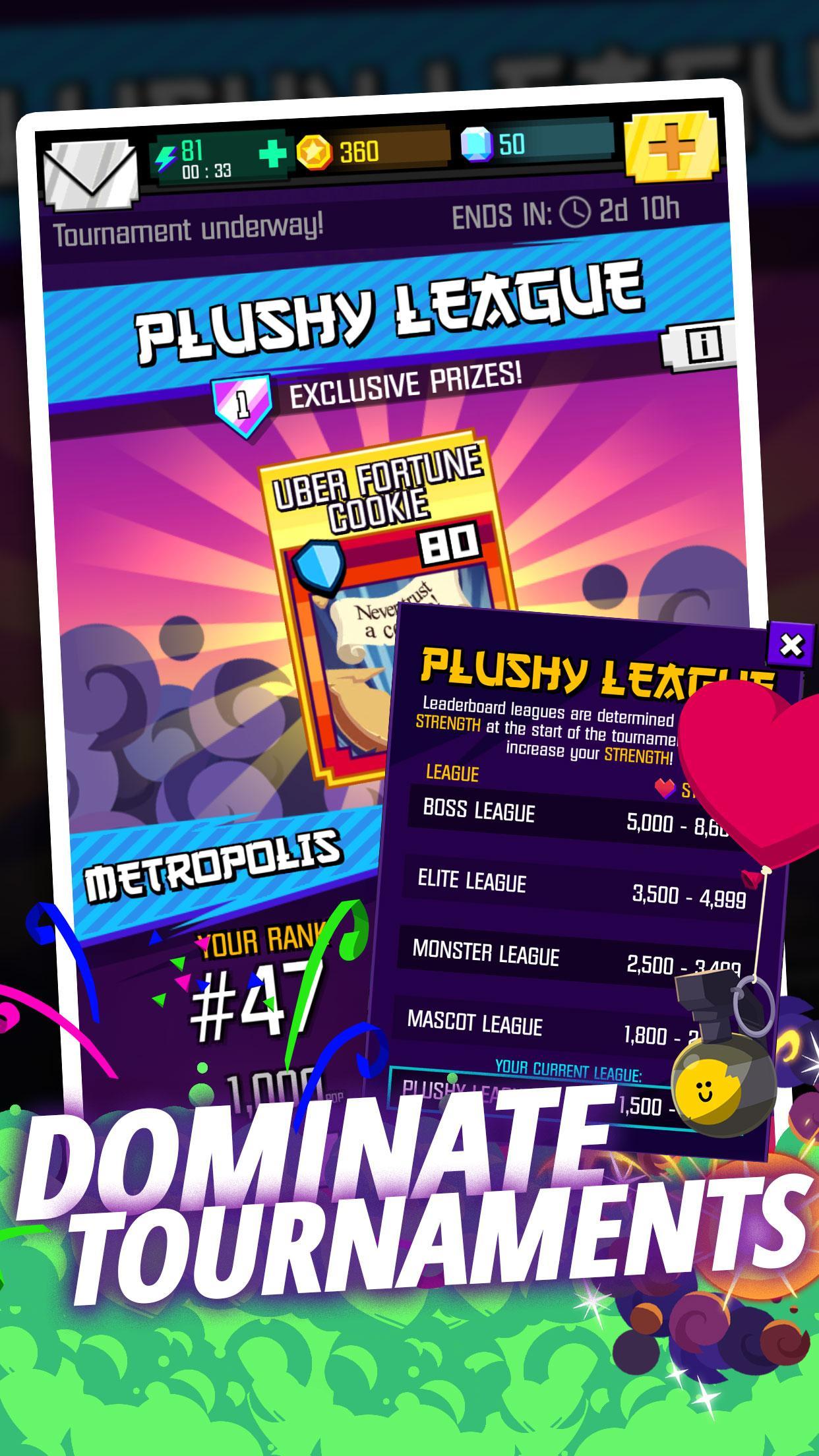 Pummel gegnerische Städte, um die Bevölkerung Ihrer Metropole zu erhöhen und sich in den wöchentlichen Turnier -Bestenlisten zu positionieren. Selbst wenn Sie verlieren oder angegriffen werden, sammeln Sie wertvolle Erfahrungen und ein paar kostbare Token. Und wenn Sie gewinnen, erhalten Sie noch mehr Erfahrungspunkte und Währung. Fünf Meilen (plüschig, Maskottchen, Monster, Elite und Boss) warten!